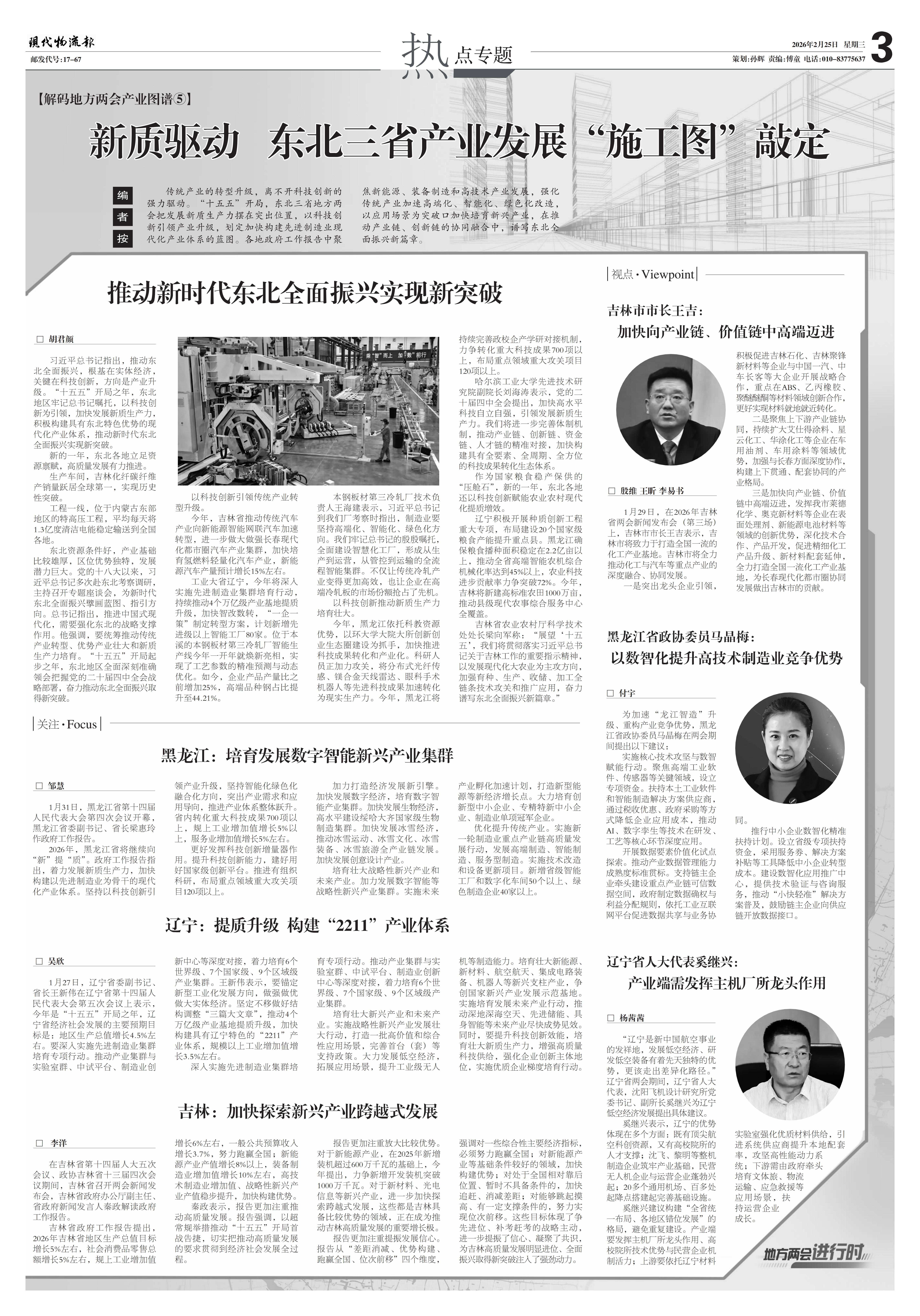 传统产业的转型升级,离不开科技创新的强力驱动。“十五五”开局,东北三省地方两会把发展新质生产力摆在突出位置,以科技创新引领产业升级,划定加快构建先进制造业现代化产业体系的蓝图。各地政府工作报告中聚焦新能源、装备制造和高技术产业发展,强化传统产业加速高端化、智能化、绿色化改造,以应用场景为突破口加快培育新兴产业,在推动产业链、创新链的协同融合中,谱写东北全面振兴新篇章。