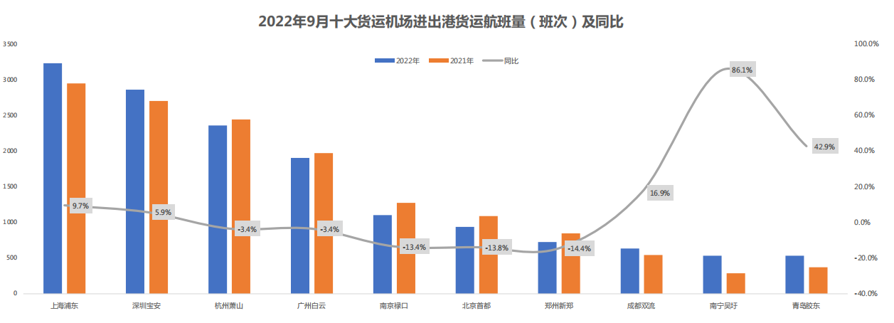 另外,9月十大货运机场执行货运航班量14852班次,同比提升2.4%,环比提升7.5%。其中,有5家机场实现同比正增长,增幅前三名的机场分别为南宁吴圩(86.1%)、青岛胶东(42.9%)、成都双流(16.9%)。