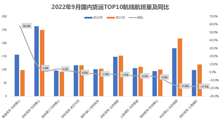 9月,国内十大货运航线的分布主要集中在长三角、珠三角、京津冀三大城市群之间。与2021年同期相比,TOP10航线中有4条航线实现正增长,增幅前三分别为青岛胶东-杭州萧山(58.6%)、深圳宝安-杭州萧山(5.6%)、泉州晋江-杭州萧山(4.3%)。与今年8月相比,TOP10航线中有6条航线实现正增长,增幅前三的航线分别为杭州萧山-北京首都(96.7%)、深圳宝安-北京首都(67.4%)、深圳宝安-杭州萧山(48.3%)。