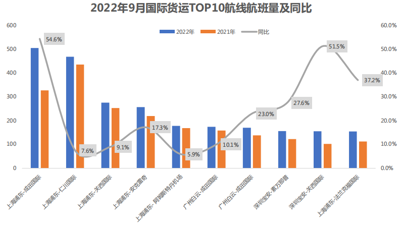 国际货运航线方面,9月,国际十大货运航线主要集中在东北亚地区,其中,国内连接日韩及泰国航线占据TOP10里的7席。TOP10国际航线与2021年同期相比均实现正增长,增幅前三名的航线分别为上海浦东-成田国际(54.6%)、深圳宝安-关西国际(51.5%)、上海浦东-法兰克福(37.2%)。
