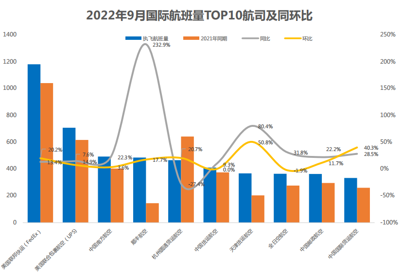 10月14日,航班管家发布的2022年9月中国航空货运运行监测数据显示,今年9月,中国货运航班总量超1.5万班次,同比提升2.9%,日均货运航班量比8月提升10.4%。