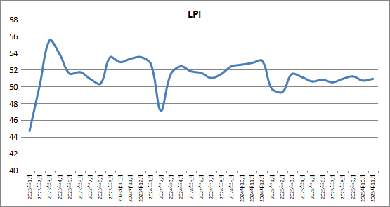 中国物流与采购联合会发布的2025年11月份中国物流业景气指数为50.9%,环比回升0.2个百分点。主要指标中,业务总量指数、新订单指数、资金周转率指数、物流服务价格指数、固定资产投资完成额指数、从业人员指数和业务活动预期指数保持处在景气区间。