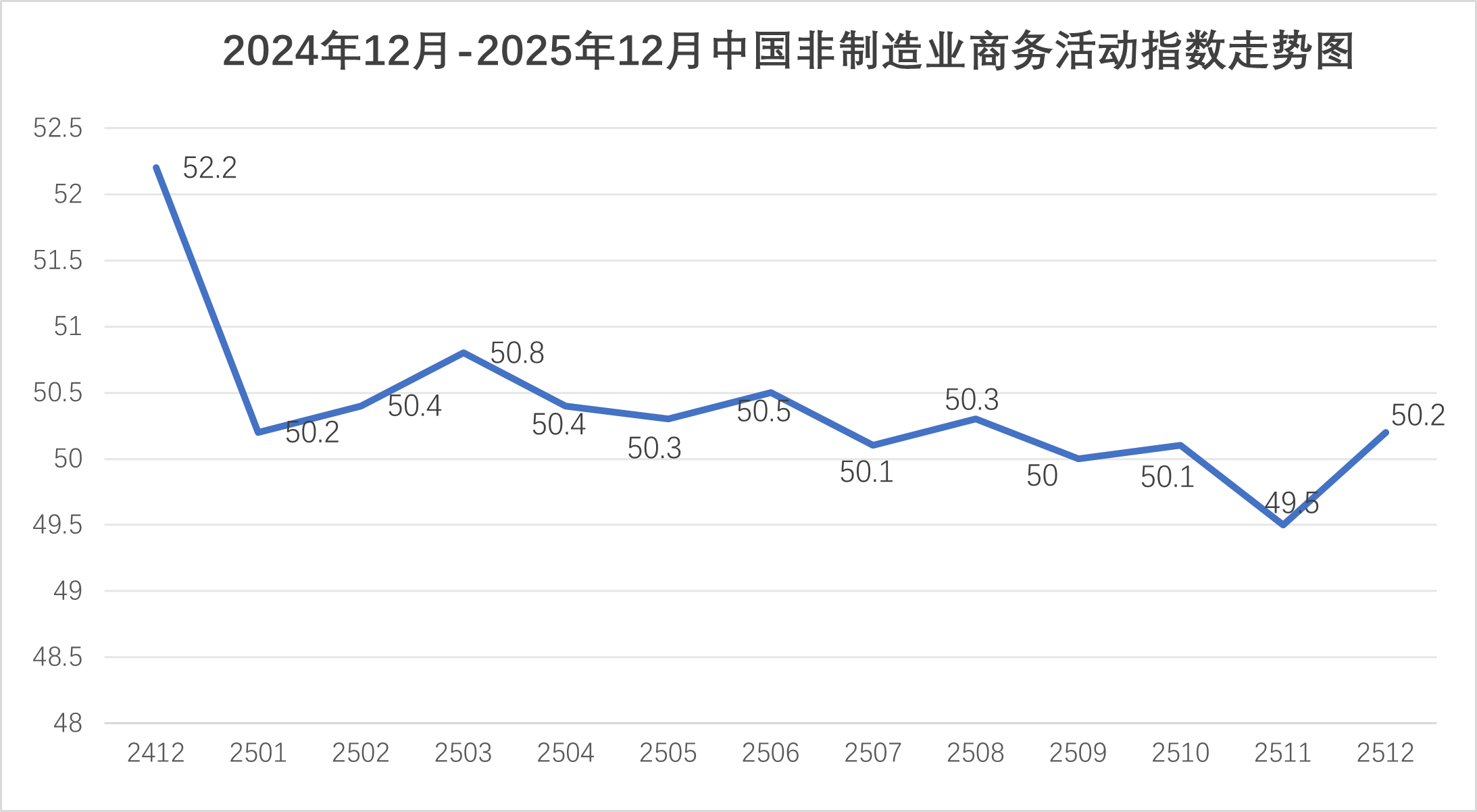 国家统计局服务业调查中心、中国物流与采购联合会发布的2025年12月份中国非制造业商务活动指数为50.2%,环比上升0.7个百分点。由于非制造业没有综合指数,通常以商务活动指数来反映非制造业经济的总体变化。