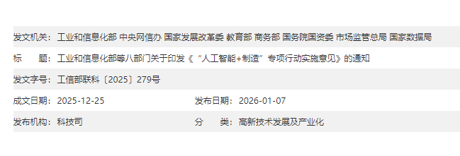 八部门关于印发《“人工智能+制造”专项行动实施意见》的通知