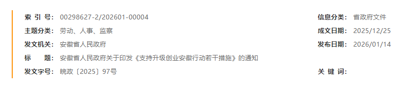 安徽省人民政府关于印发《支持升级创业安徽行动若干措施》的通知