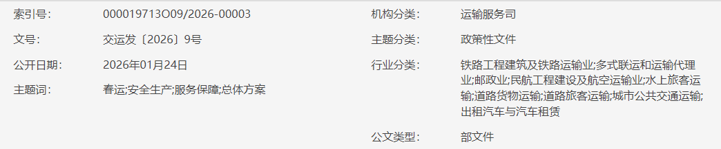 交通运输部 公安部 应急管理部 中国气象局 国家铁路局 中国民用航空局 国家邮政局 中国国家铁路集团有限公司关于印发《2026年综合运输春运安全生产和服务保障总体方案》的通知