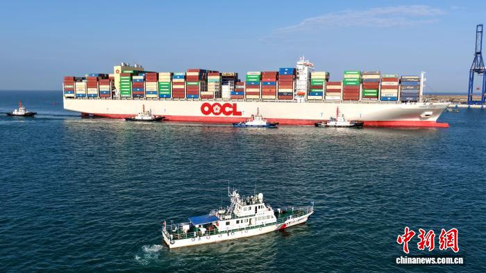 图为执法人员护航大型集装箱船舶进入洋浦港。洋浦海事局供图