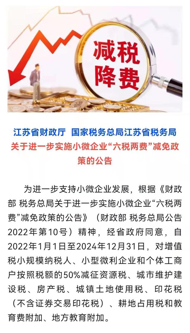 公告称,为进一步支持小微企业发展,根据《财政部 税务总局关于进一步实施小微企业“六税两费”减免政策的公告》(财政部 税务总局公告2022年第10号)精神,经江苏省政府同意,自2022年1月1日至2024年12月31日,对增值税小规模纳税人、小型微利企业和个体工商户按照税额的50%减征资源税、城市维护建设税、房产税、城镇土地使用税、印花税(不含证券交易印花税)、耕地占用税和教育费附加、地方教育附加。