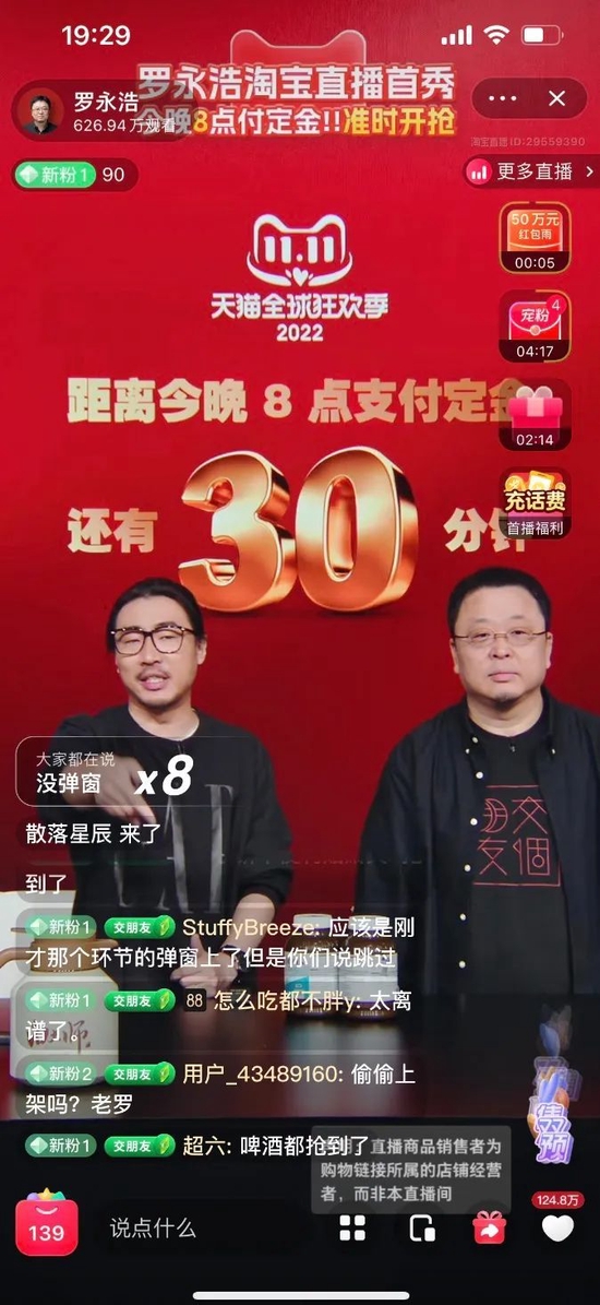 10月31日晚8点,天猫“双11”第一波售卖正式开启。除了“淘宝一哥”李佳琦,淘宝直播间里还多了几张“抖音顶流”的面孔:交个朋友罗永浩、新东方俞敏洪,以及刘畊宏的妻子王婉霏ViVi。