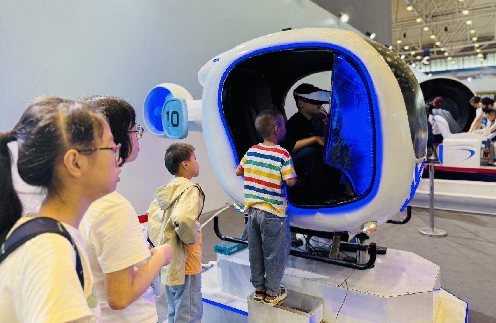 在第十三届中国(绵阳)科技城国际科技博览会展馆里,小朋友在排队体验飞行模拟器。付乔崧 摄