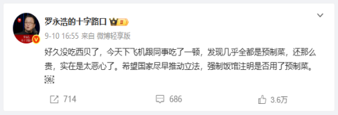 9月10日,锤子科技创始人罗永浩在社交平台表示,“几乎全都是预制菜,还那么贵”,并呼吁立法强制餐馆注明是否使用预制菜。