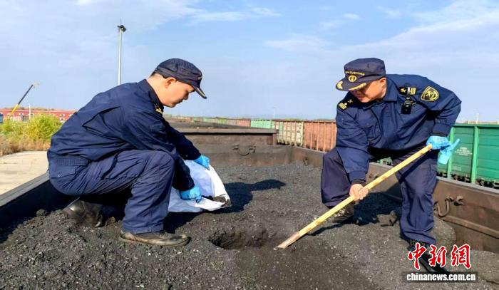 同江海关关员进行煤炭取样查验。 同江市委宣传部供图