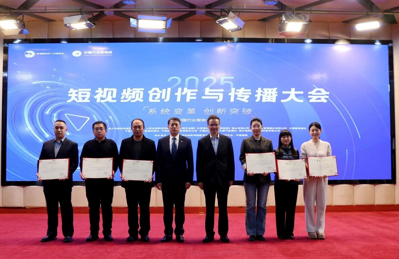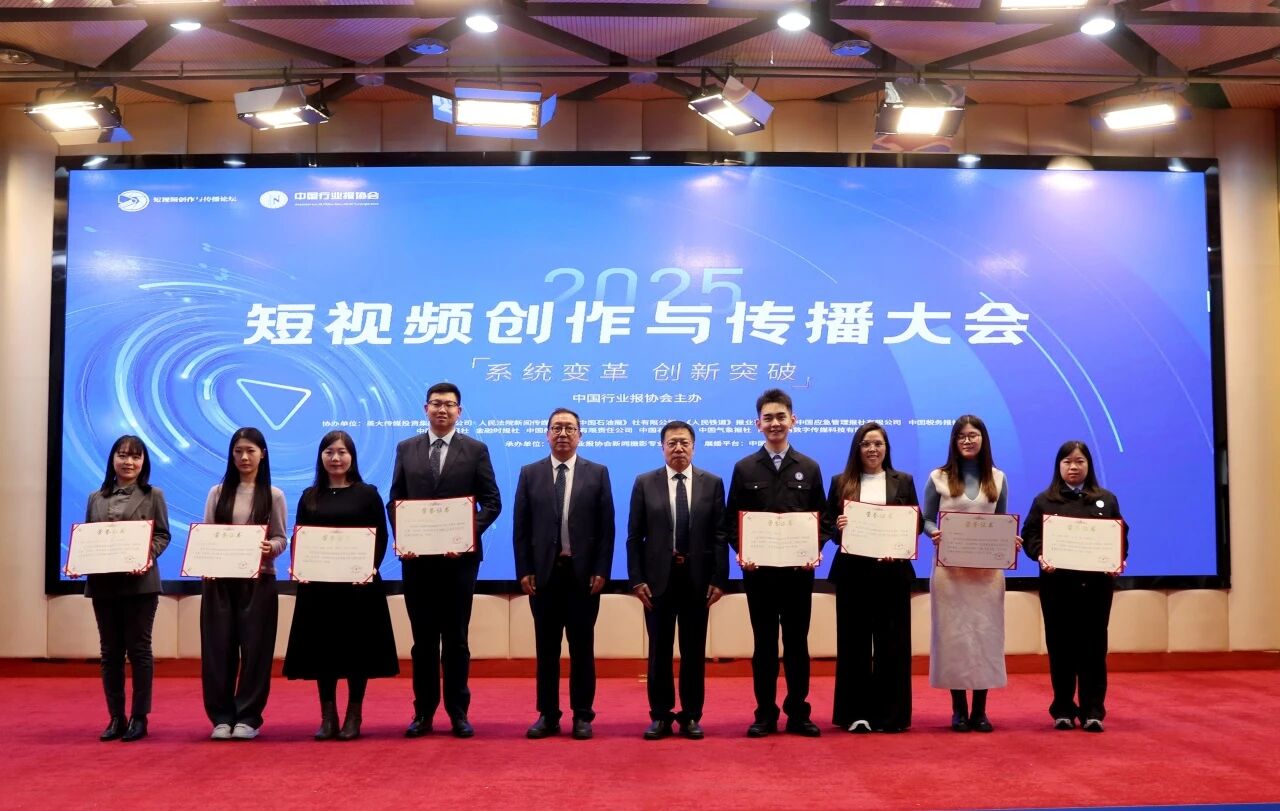 《人民铁道》报业有限公司党委书记、董事长谭小建(右四),《中国石油报》社有限公司总经理、党委副书记耿玉锋(左四)向2025行业媒体短视频大赛二等奖获奖代表颁发证书。董芳忠/摄