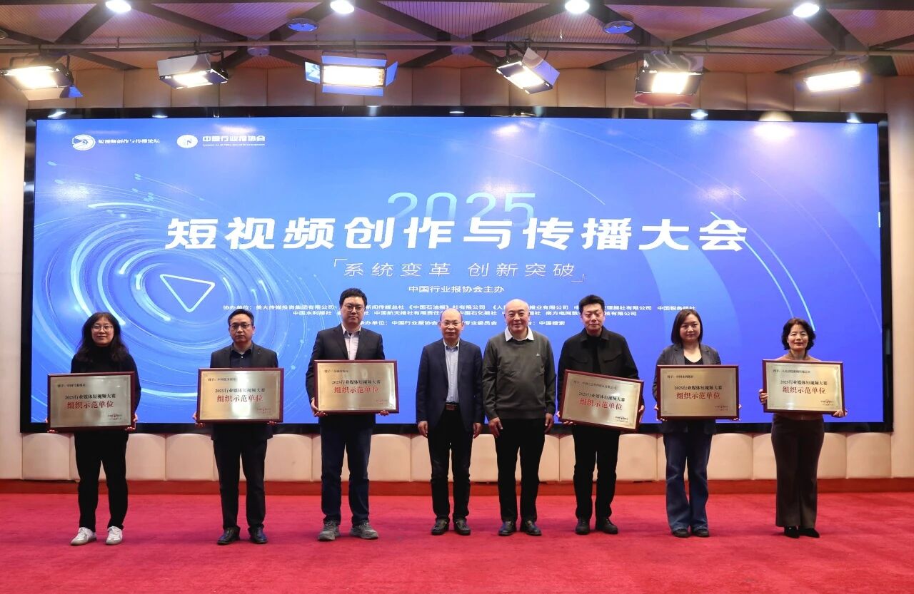 中国石化报社社长、总编辑杨守娟(右五),中国税务报社党委书记、社长付树林(左四)向2025行业媒体短视频大赛二等奖获奖代表颁发证书。董芳忠/摄