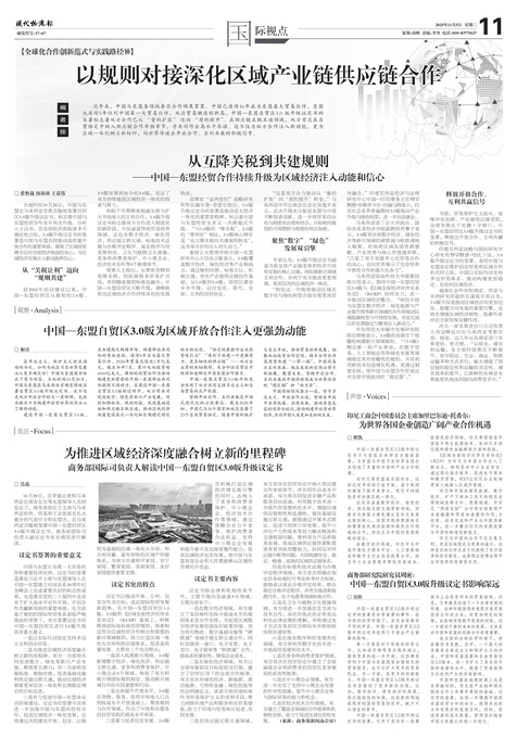 菲律宾“亚洲世纪”战略研究所所长赫尔曼·劳雷尔指出,3.0版升级议定书的签署是推动亚太经济一体化的重要里程碑,标志着中国与东盟经贸关系又一次跨越式升级。“与1.0版的‘降关税’、2.0版的‘便利化’相比,3.0版核心特征是‘由互降关税向共建规则转变’,这为双方合作注入持久动力。”