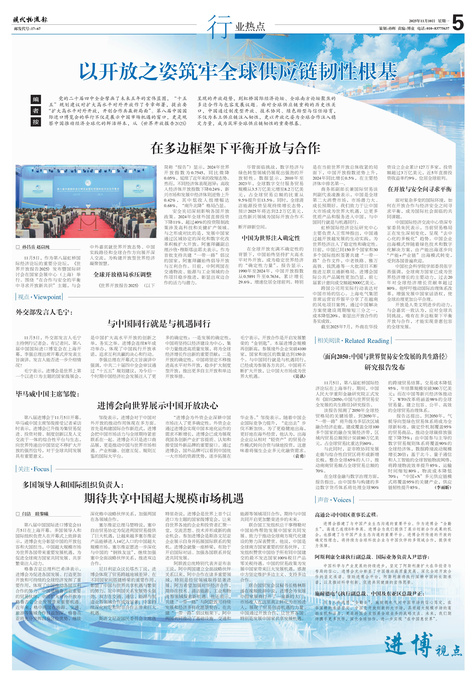 党的二十届四中全会擘画了未来五年的宏伟蓝图,“十五五”规划建议对扩大高水平对外开放作了专章部署,提出要“扩大高水平对外开放,开创合作共赢新局面”。第八届中国国际进口博览会的举行不仅是展示中国市场机遇的窗口,更是观察中国推动经济全球化的鲜活样本,从《世界开放报告2025》呈现的开放趋势,到虹桥国际经济论坛、全球南方论坛聚焦的多边合作与包容发展议题。面对全球供应链重构的历史性关口,中国通过制度型开放、技术协同、绿色转型与信任培育,不仅为本土供应链注入韧性,更以开放之姿为全球合作注入稳定力量,成为筑牢全球供应链韧性的重要根基。