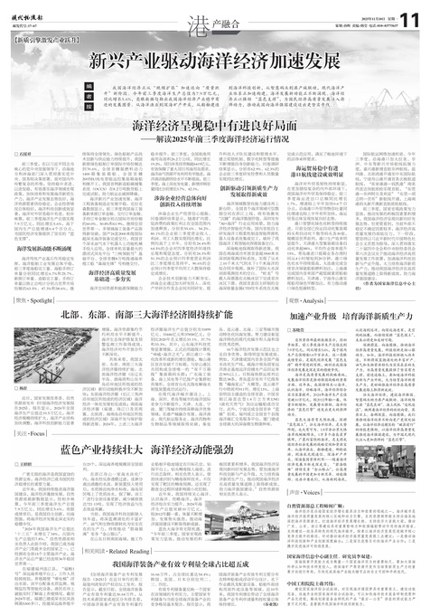我国海洋经济正从“规模扩张”加速迈向“质量跃升”新阶段。今年前三季度海洋生产总值为7.9万亿元,同比增长5.6%,亮眼数据勾勒出我国海洋经济产业稳中有进的发展图景。从海洋渔业到深海矿产开采,从船舶建造到海洋科技创新,从智慧码头到港产城联动,现代海洋产业体系正加速构建,海洋发展新动能正不断涌现。海洋经济正以强劲“蓝色支撑”,为国民经济高质量发展注入澎湃动力,推动我国向海洋强国建设迈出更坚实步伐。
