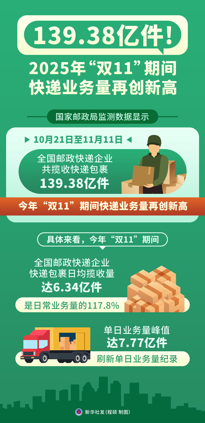 具体来看,今年“双11”期间,全国邮政快递企业快递包裹日均揽收量达6.34亿件,是日常业务量的117.8%;单日业务量峰值达7.77亿件,刷新单日业务量纪录。