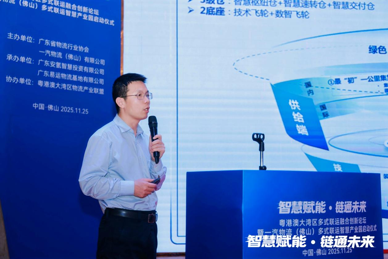 广东安氢智慧投资有限公司董事长曹龙盛在《一汽物流(佛山)多式联运智慧产业园赋能大湾区多式联运降本增效》主题演讲中提出,产业园将以智慧赋能与集成运作为核心,构建起降本增效的“智慧大脑”与“实体枢纽”。