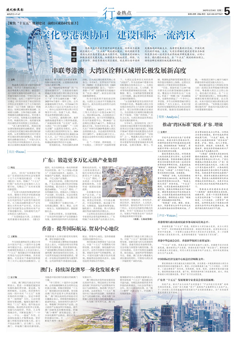 粤港澳大湾区是中国开放程度最高、经济活力最强的区域之一。“十五五”规划建议提出,要巩固提升粤港澳大湾区高质量发展动力源作用,支持港澳更好融入和服务国家发展大局,加强港澳与内地经贸、科技、人文等合作。推进粤港澳大湾区建设,就是要打造中国新发展格局的战略支点、高质量发展的示范地、中国式现代化的引领地。未来,大湾区将锚定建设富有活力和国际竞争力的一流湾区及世界级城市群发展目标,以同心协力、稳扎稳打的姿态,在“十五五”规划的新征程上,持续诠释区域增长极发展的新高度。