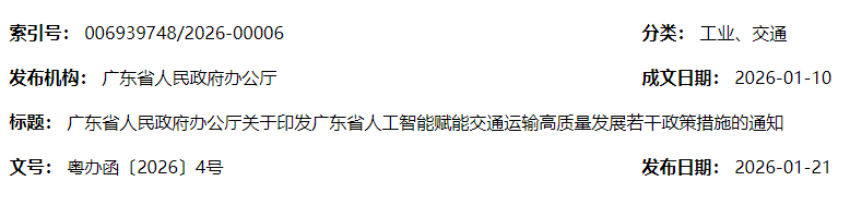 《广东省人工智能赋能交通运输高质量发展若干政策措施》已经省人民政府同意,现印发给你们,请认真组织实施。实施中遇到的问题,请径向省交通运输厅反映。