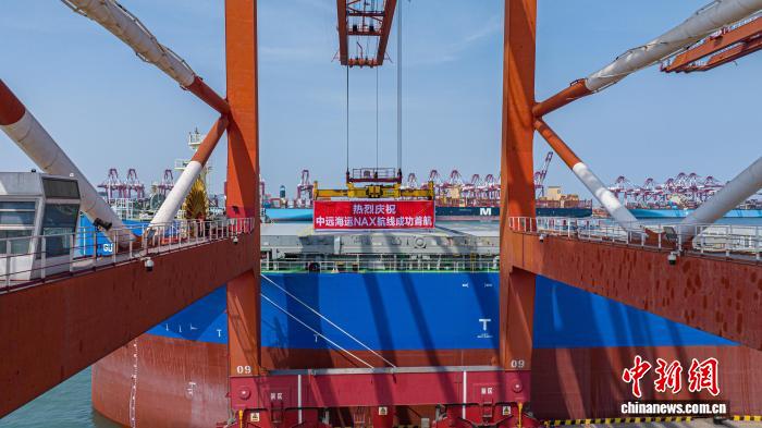 3月29日,中远海运北非航线在青岛港首航。(无人机照片 青岛港供图)