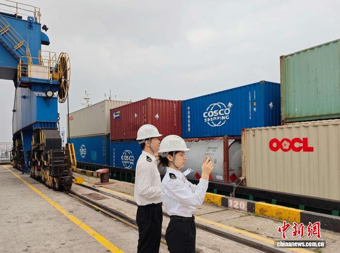黄埔新港海关关员对进口“水水中转”多式联运集装箱进行监管。黄捷 摄