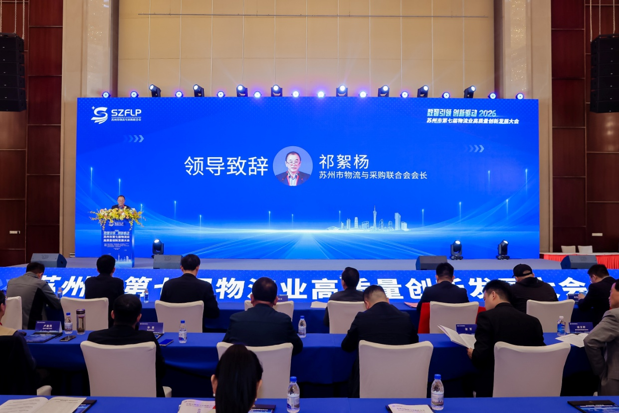 2026年4月24日,由苏州市物流与采购联合会主办的第七届苏州市物流业高质量创新发展大会在苏州成功举办。本次大会以“数智引领、创新驱动”为核心主题,紧扣数智创新这一行业转型核心方向,汇聚行业主管部门、权威专家、领军企业及物流领域同仁,重点围绕数智技术在物流全链路的深度应用、本地企业数智创新实践、行业数智化发展路径等核心议题,共话行业发展新趋势、共谋高质量发展新路径。中国物流与采购联合会副会长胡大剑、苏州市发改委经贸处王宁处长等领导出席大会并致辞,全市物流行业代表齐聚一堂,总结数智创新成果、分享前沿实践经验、擘画数智化发展蓝图,为苏州现代物流业高质量发展注入强劲数智动能。