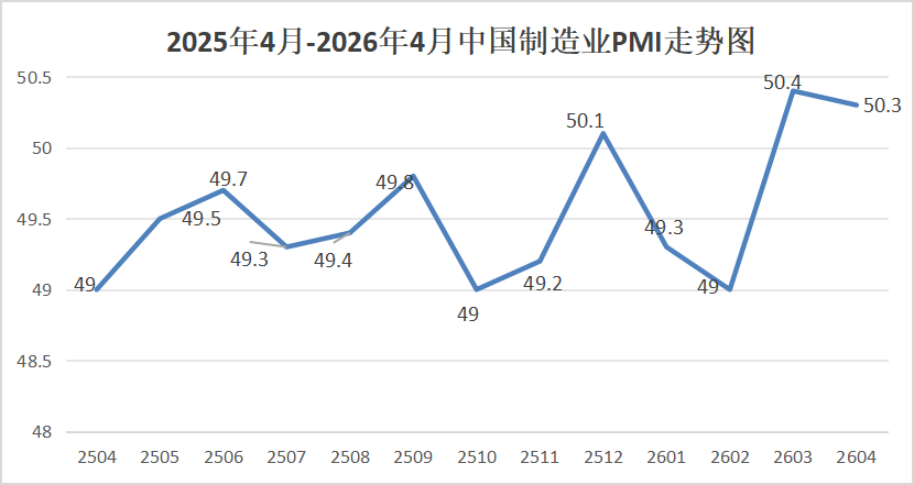 国家统计局服务业调查中心、中国物流与采购联合会发布的2026年4月份中国制造业采购经理指数(PMI)为50.3%,比上月下降0.1个百分点。