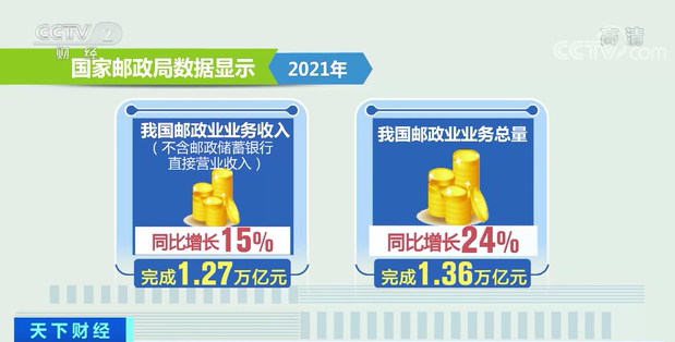 国家邮政局数据显示,2021年我国邮政业业务收入(不含邮政储蓄银行直接营业收入)和业务总量分别完成1.27万亿元和1.36万亿元,同比分别增长15%和24%;快递业务收入和业务量分别完成1.04万亿元和1085亿件,同比分别增长18%和30%。新增社会就业20万人以上,支撑网络零售额接近11万亿元。